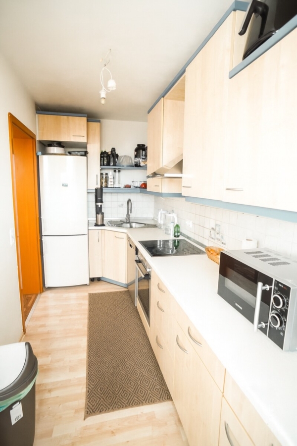 Beim Betreten der Wohnung empfängt Sie ein großzügiger Flur mit viel Platz für Garderobe und Stauraum. Von hier aus gelangen Sie in den hellen Wohn- und Essbereich, der durch große Fenster lichtdurchflutet ist und direkten Zugang zum Balkon bietet – ein idealer Ort zum Entspannen.