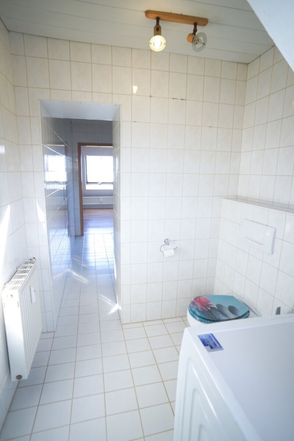 Über eine Treppe gelangen Sie in die obere Ebene der Maisonettewohnung. Hier erwarten Sie zwei weitere Schlafzimmer, zwei helle Wohnbereiche sowie ein zweites Badezimmer mit Tageslicht, ausgestattet mit Badewanne, Waschbecken, Toilette und Waschmaschinenanschluss.